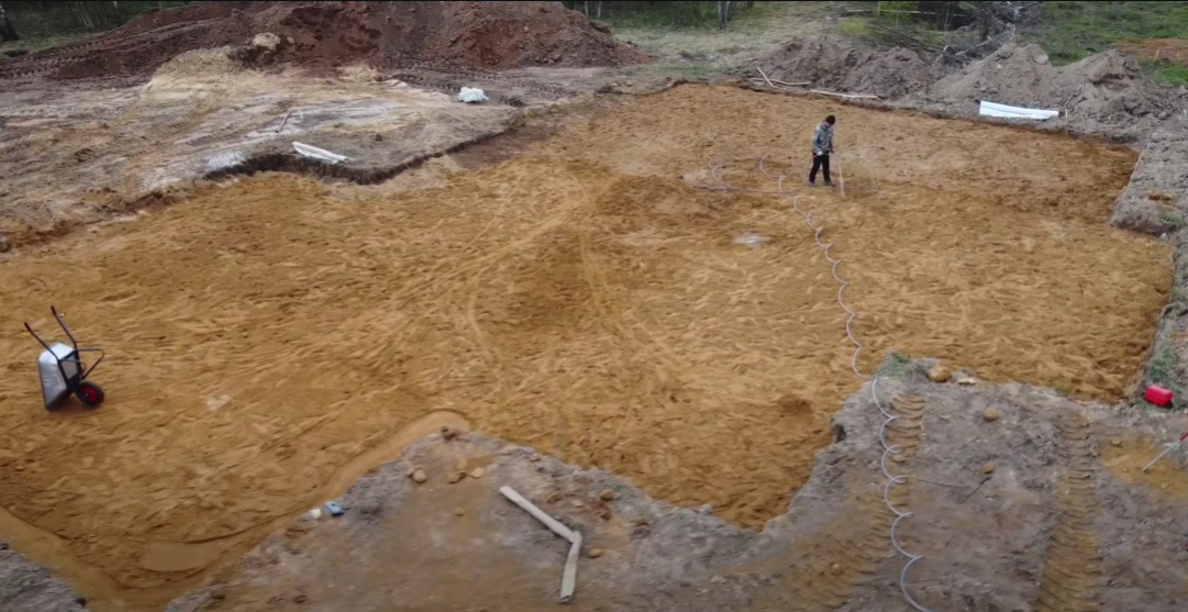 Еще один важный этап — проверка инженерных коммуникаций. По нормативам, на 1 метр Для канализационной трубы должен быть уклон в 2 сантиметра. Вода при этом заглубляется на глубину промерзания 1 метр 30 сантиметров, а электричество — на полметра. На каждом этапе для заказчика мы делаем полный видеоотчет о проделанной работе. После инженерной части мы перешли к стандартным этапам — отсыпке и утрамбовке песка.