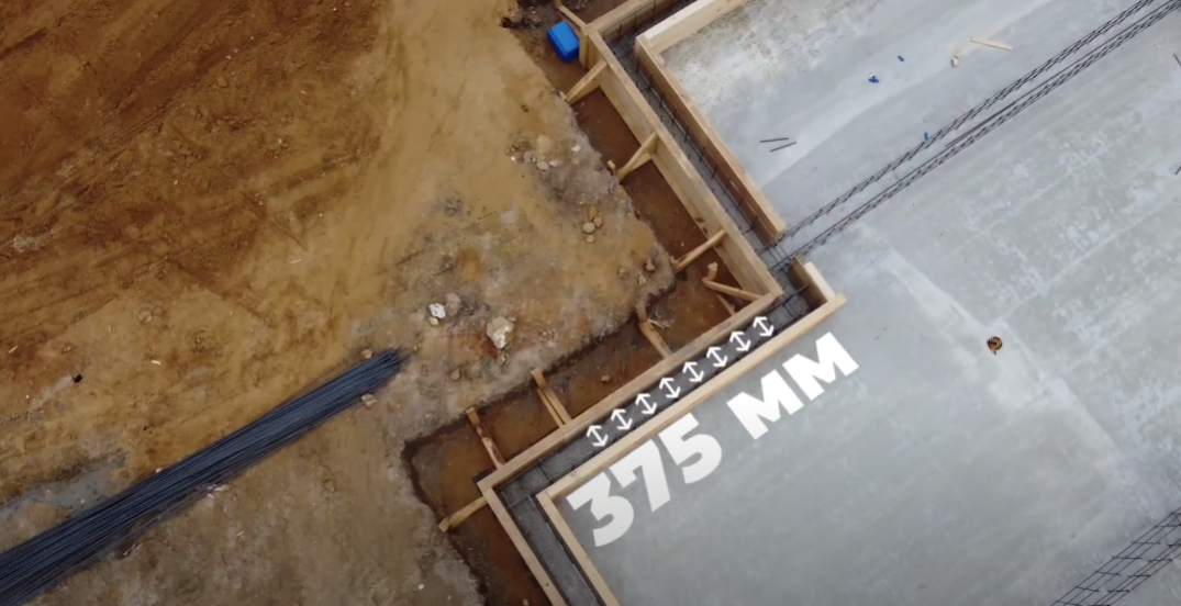 Вы можете заметить, что плита заливалась в два этапа. Сперва сама плита, затем ребра жесткости. Такая последовательность продиктована тем, что рёбра жёсткости высокие и при одновременной заливке есть риск выдавливания опалубки. Ширина рёбер жёсткости была спроектирована точно под ширину блоков будущего дома — 375 мм. Был сделан холодный шов между плитой и рёбрами.